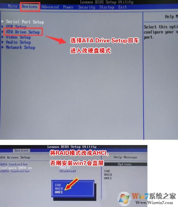 4、切將鍵盤移動Devices選項,把鍵盤移動ATA Drive Setup回車,將configure SATA as中默認的raid改成ahci模式,否則安裝win7時會出現(xiàn)0x0000007b藍屏,因為win7中沒有集成raid硬盤驅動,然后選擇F10保存設置,在彈出的選項中選擇YES,如下圖所示;