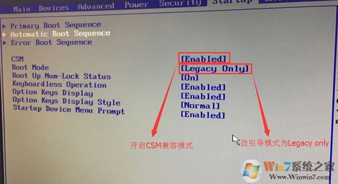 3、切換到Boot,把Boot Mode從UEFI改成Legacy only引導模式,再把csm默認disabled改成enabled,開啟兼容模式;
