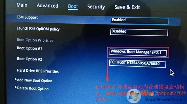 3、繼續(xù)把boot option#1選項改為普通引導(dǎo)的,boot option#1和boot option#2硬盤啟動位置對換,設(shè)置第一啟動項為普通硬盤引導(dǎo),帶Windwos Boot Manager的為UEFI引導(dǎo)分區(qū);