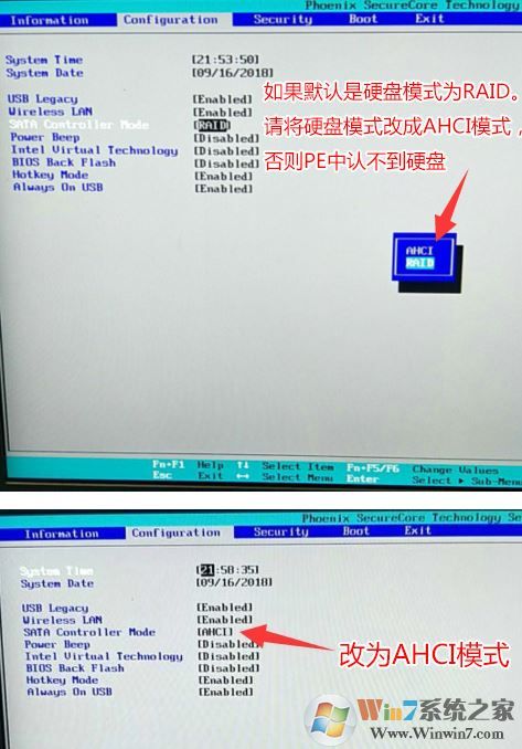 6、注意:再返回configuration這項(xiàng),查看sata controller mode這項(xiàng),如果默認(rèn)硬盤模式為RAID,請(qǐng)將硬盤模式改為AHCI模式,否則進(jìn)PE后不能認(rèn)出硬盤,如果更改后記得按F10保存,如圖: