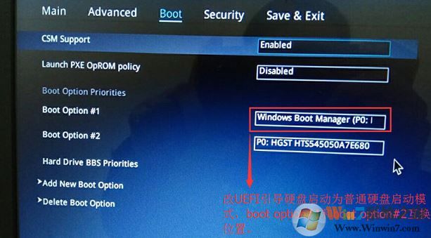 3、繼續(xù)把boot option#1選項(xiàng)改為普通引導(dǎo)的,boot option#1和boot option#2硬盤(pán)啟動(dòng)位置對(duì)換,設(shè)置第一啟動(dòng)項(xiàng)為普通硬盤(pán)引導(dǎo),帶Windwos Boot Manager的為UEFI引導(dǎo)分區(qū),然后按F10保存;