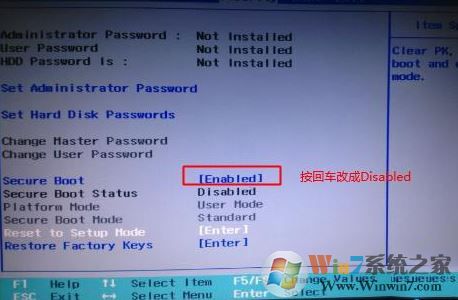 1、開機(jī)一直按F2或(FN+F2)進(jìn)入BIOS,按→方向鍵切換到Security,選擇Secure Boot回車設(shè)置成Disabled,如圖: