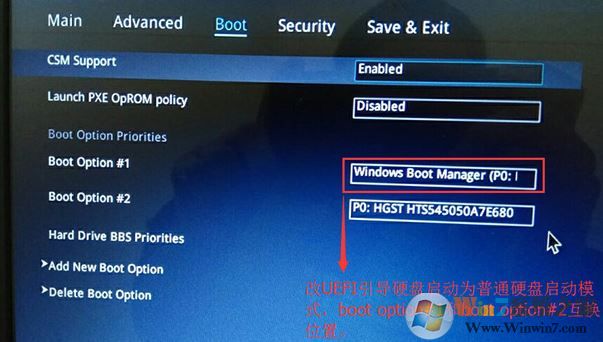 3、繼續(xù)把boot option#1選項改為普通引導的,boot option#1和boot option#2硬盤啟動位置對換,設置第一啟動項為普通硬盤引導,帶Windwos Boot Manager的為UEFI引導分區(qū);
