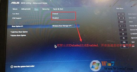 2、重啟后切換到BOOT的選項,分別把fast boot和csm support由disabled改成enabled,分別開啟快速啟動和兼容模式;
