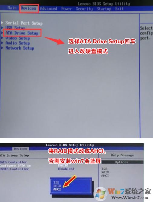 4、切將鍵盤移動Devices選項,把鍵盤移動ATA Drive Setup回車,將configure SATA as中默認的raid改成ahci模式,否則安裝win7時會出現(xiàn)0x0000007b藍屏,因為win7中沒有集成raid硬盤驅動,然后選擇F10保存設置,在彈出的選項中選擇YES,如下圖所示;