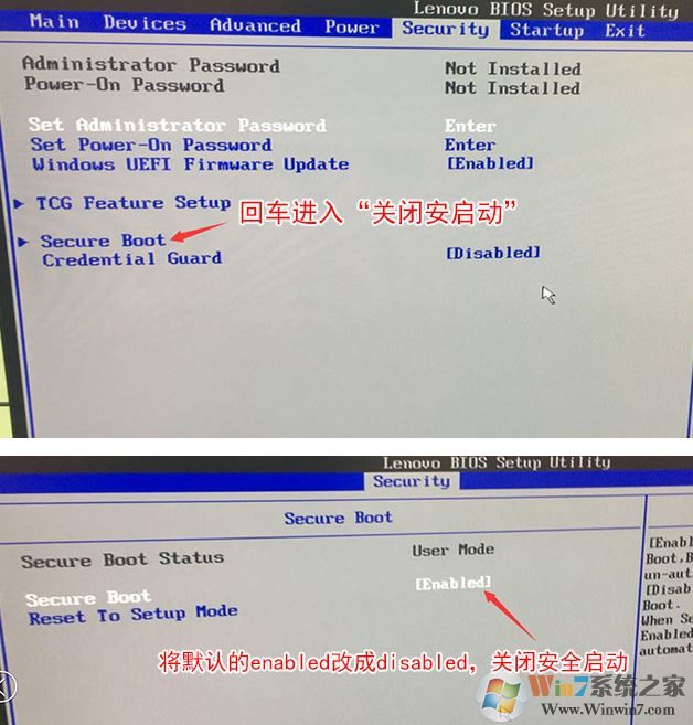 1、開機一直按F2或(FN+F2)進入BIOS,按→方向鍵切換到Security,選擇Secure Boot回車設置成Disabled;