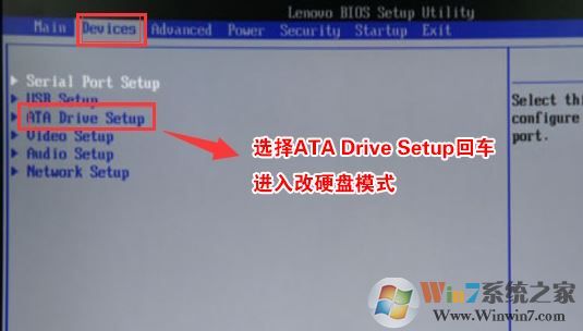 4、切將鍵盤移動Devices選項,把鍵盤移動ATA Drive Setup回車,將configure SATA as中默認的raid改成ahci模式,否則安裝win7時會出現(xiàn)0x0000007b藍屏,因為win7中沒有集成raid硬盤驅動,然后選擇F10保存設置,在彈出的選項中選擇YES,如下圖所示;
