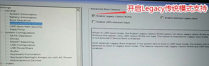 3、切換到Advanced Boot Options將右邊的Enable legacy option roms選項(xiàng)打勾,如下圖所示;