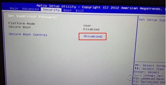 1、開(kāi)機(jī),按F2鍵進(jìn)入BIOS設(shè)置頁(yè)面,選擇“Security”,在“Security”頁(yè)面下找到“Secure Boot Control”并設(shè)置成Disabled,這里主要是關(guān)閉“安全啟動(dòng)”;