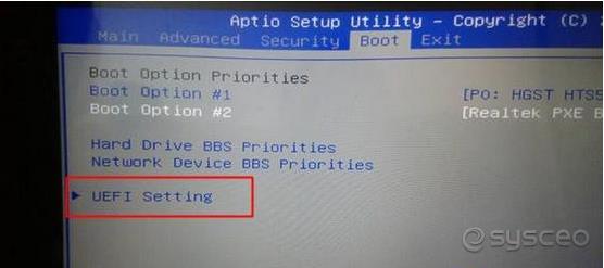 2、再用鍵盤上下左右鍵,移動(dòng)到“Boot”頁(yè)面,找到“UEFI Setting”選項(xiàng),并設(shè)置成Enabled(如果有“LaunchCSM”,設(shè)置為Enabled),開(kāi)啟兼容模式,按F4保存設(shè)置;