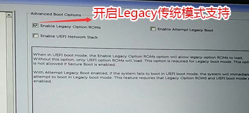 3、切換到Advanced Boot Options將右邊的Enable legacy option roms選項(xiàng)打勾,如下圖所示;