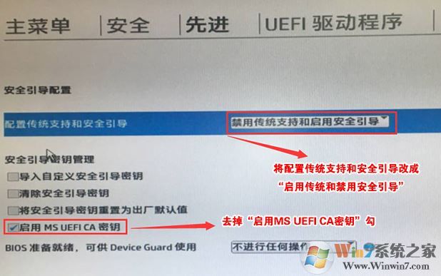 3、回車后,將配置傳統(tǒng)支持和安全引導(dǎo)設(shè)置電腦“啟用傳統(tǒng)支持和禁用安全引導(dǎo)”以及去掉“啟用MS UEFI CA密鑰”前面的勾,然后按F10保存更改;