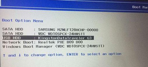 4、插入制作好的U盤啟動盤,重啟按F12或FN+F12調(diào)出啟動管理對話框,選擇USB HDD識別到U盤啟動進入PE,回車;