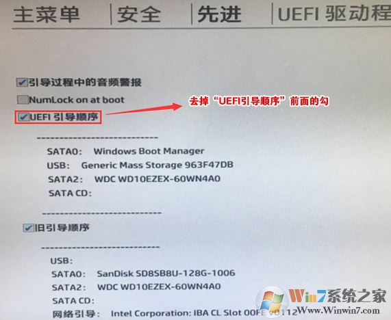 6、進入后將UEFI順序前面的勾去掉,讓機器默認為傳統(tǒng)啟動,這樣方便安裝WIN7,如圖所示: