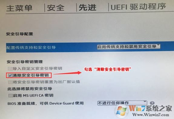 4、F10保存重啟后再次開機按ESC,然后選擇F10進入BIOS設(shè)置,將進入剛設(shè)置的地方,勾選“清除安全引導(dǎo)密鑰”,然后再次F10保存,如圖: