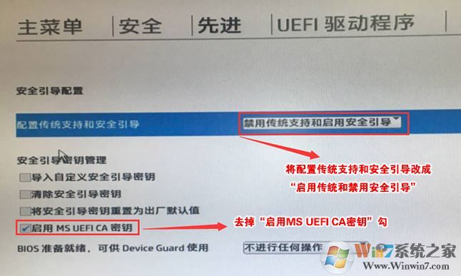 3、回車后,將配置傳統(tǒng)支持和安全引導(dǎo)設(shè)置電腦“啟用傳統(tǒng)支持和禁用安全引導(dǎo)”以及去掉“啟用MS UEFI CA密鑰”前面的勾,然后按F10保存更改,如圖: