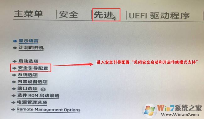 2、進入BIOS后,將移動鍵盤到“先進”選項下,選擇"安全引導(dǎo)配置",按回車鍵進入設(shè)置,如圖: