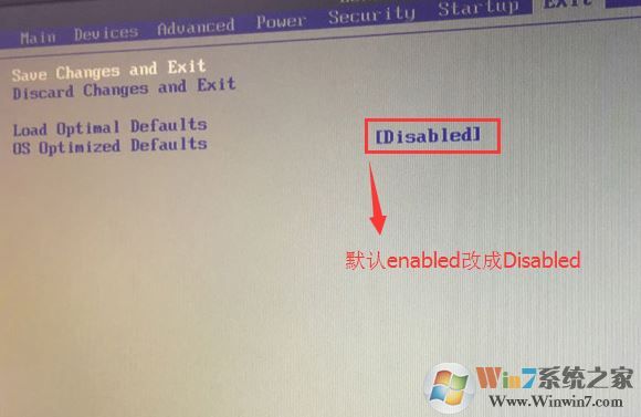 2、轉(zhuǎn)到Exit,把OS Optimized Defaults設(shè)置為Disabled;