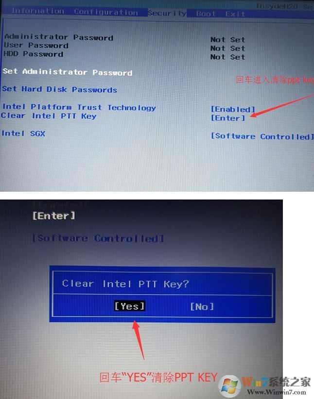 注:按如果Security選項(xiàng)下沒有Secure Boot選項(xiàng),看下是否有"clear intel PTT Key"選項(xiàng),如果有進(jìn)入回車選選擇“yes”清除ppt key,否則無法安裝系統(tǒng)后無法引導(dǎo)啟動(dòng),如下圖所示;