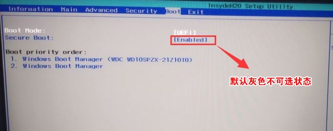 1、開機一直按F2進入BIOS,按F2進入BIOS界面,選擇BOOT項后發(fā)現(xiàn)secure boot灰色不可選狀態(tài),如下圖所示;