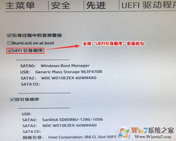 6、進(jìn)入后將UEFI順序前面的勾去掉,讓機(jī)器默認(rèn)為傳統(tǒng)啟動(dòng),這樣方便安裝WIN7,如下圖所示;