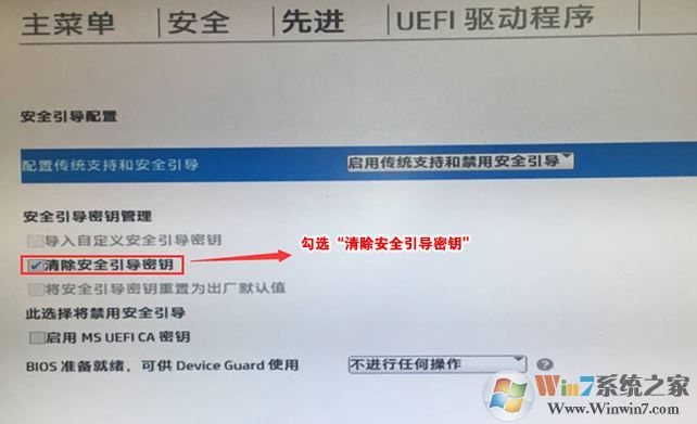 4、F10保存重啟后再次開機(jī)按ESC,然后選擇F10進(jìn)入BIOS設(shè)置,將進(jìn)入剛設(shè)置的地方,勾選“清除安全引導(dǎo)密鑰”,然后再次F10保存;