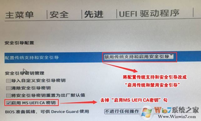 3、回車后,將配置傳統(tǒng)支持和安全引導(dǎo)設(shè)置電腦“啟用傳統(tǒng)支持和禁用安全引導(dǎo)”以及去掉“啟用MS UEFI CA密鑰”前面的勾,然后按F10保存更改;