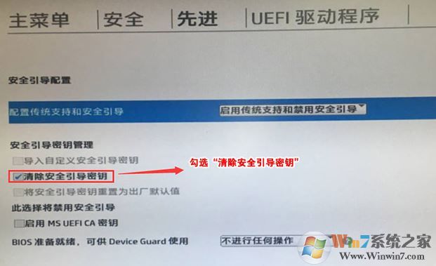 4、F10保存重啟后再次開機(jī)按ESC,然后選擇F10進(jìn)入BIOS設(shè)置,將進(jìn)入剛設(shè)置的地方,勾選“清除安全引導(dǎo)密鑰”,然后再次F10保存;