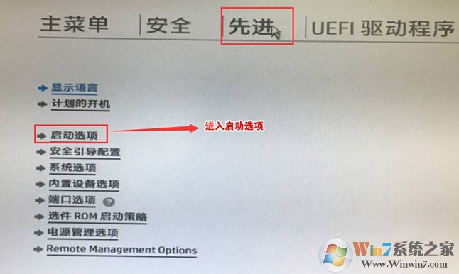 5、F10保存重啟后再次開機(jī)按ESC,然后選擇F10進(jìn)入BIOS設(shè)置,將鼠標(biāo)移動(dòng)“先進(jìn)”選項(xiàng)中,選擇"啟動(dòng)選項(xiàng)"后回車進(jìn)入,如下圖所示: