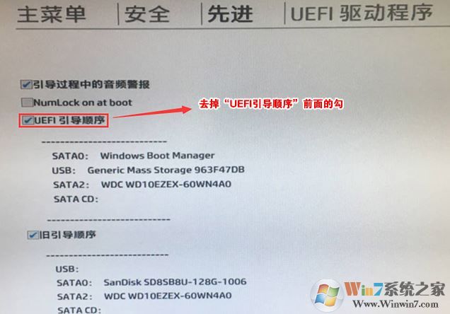 6、進(jìn)入后將UEFI順序前面的勾去掉,讓機(jī)器默認(rèn)為傳統(tǒng)啟動(dòng),這樣方便安裝WIN7,如下圖所示;