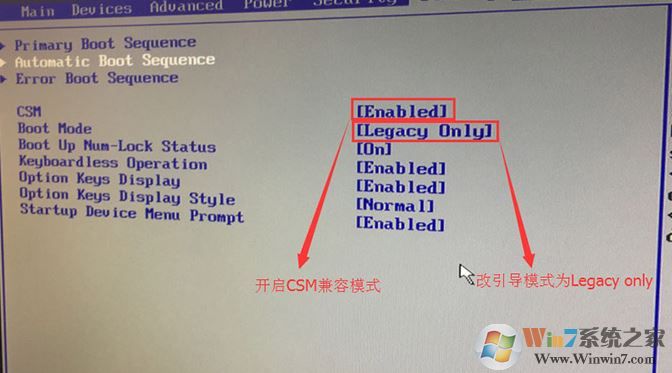 3、切換到Boot,把Boot Mode從UEFI改成Legacy only引導(dǎo)模式,再把csm默認disabled改成enabled,開啟兼容模式,選擇F10保存設(shè)置,在彈出的選項中選擇YES;