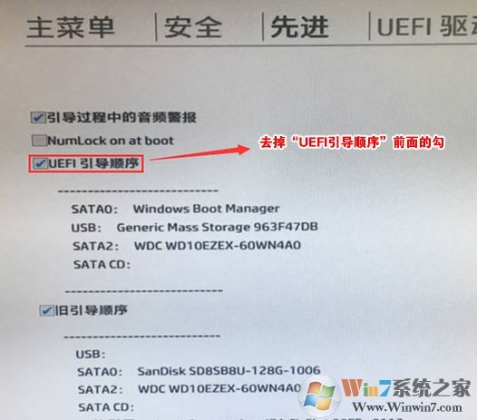 6、進(jìn)入后將UEFI順序前面的勾去掉,讓機(jī)器默認(rèn)為傳統(tǒng)啟動,這樣方便安裝WIN7,如圖: