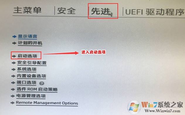 5、F10保存重啟后再次開機(jī)按ESC,然后選擇F10進(jìn)入BIOS設(shè)置,將鼠標(biāo)移動“先進(jìn)”選項中,選擇"啟動選項"后回車進(jìn)入,如圖: