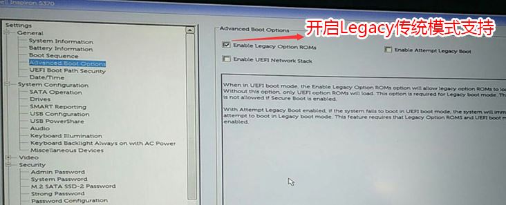 3、切換到Advanced Boot Options將右邊的Enable legacy option roms選項打勾,如下圖所示;