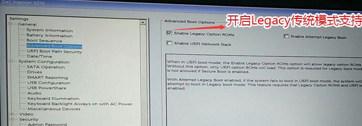 3、切換到Advanced Boot Options將右邊的Enable legacy option roms選項打勾,如圖: