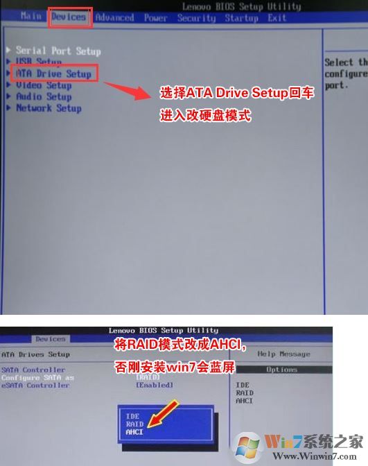4、切將鍵盤移動Devices選項(xiàng),把鍵盤移動ATA Drive Setup回車,將configure SATA as中默認(rèn)的raid改成ahci模式,否則安裝win7時(shí)會出現(xiàn)0x0000007b藍(lán)屏,因?yàn)閣in7中沒有集成raid硬盤驅(qū)動,然后選擇F10保存設(shè)置,在彈出的選項(xiàng)中選擇YES,如下圖所示;