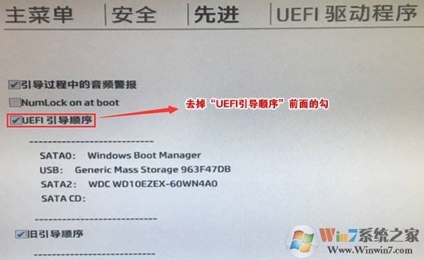 6、進(jìn)入后將UEFI順序前面的勾去掉,讓機(jī)器默認(rèn)為傳統(tǒng)啟動(dòng),這樣方便安裝WIN7,如下圖所示;