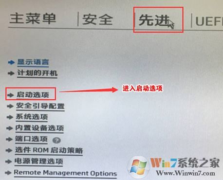 5、F10保存重啟后再次開機(jī)按ESC,然后選擇F10進(jìn)入BIOS設(shè)置,將鼠標(biāo)移動(dòng)“先進(jìn)”選項(xiàng)中,選擇"啟動(dòng)選項(xiàng)"后回車進(jìn)入,如下圖所示;