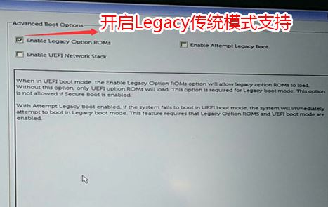 3、切換到Advanced Boot Options將右邊的Enable legacy option roms選項打勾,如下圖所示;