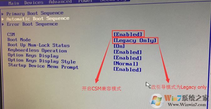 3、切換到Boot,把Boot Mode從UEFI改成Legacy only引導模式,再把csm默認disabled改成enabled,開啟兼容模式,選擇F10保存設(shè)置,在彈出的選項中選擇YES;