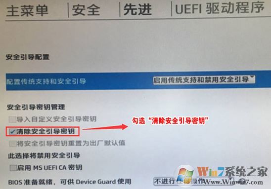 4、F10保存重啟后再次開機(jī)按ESC,然后選擇F10進(jìn)入BIOS設(shè)置,將進(jìn)入剛設(shè)置的地方,勾選“清除安全引導(dǎo)密鑰”,然后再次F10保存;