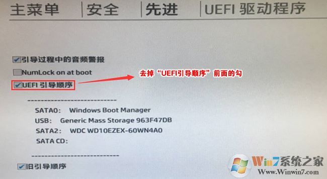 6、進入后將UEFI順序前面的勾去掉,讓機器默認為傳統(tǒng)啟動,這樣方便安裝WIN7,如下圖所示;