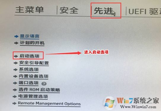 5、F10保存重啟后再次開機按ESC,然后選擇F10進入BIOS設置,將鼠標移動“先進”選項中,選擇"啟動選項"后回車進入,如下圖所示;