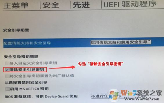 4、F10保存重啟后再次開機按ESC,然后選擇F10進入BIOS設置,將進入剛設置的地方,勾選“清除安全引導密鑰”,然后再次F10保存;