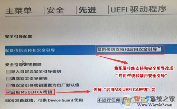 3、回車后,將配置傳統(tǒng)支持和安全引導設置電腦“啟用傳統(tǒng)支持和禁用安全引導”以及去掉“啟用MS UEFI CA密鑰”前面的勾,然后按F10保存更改;