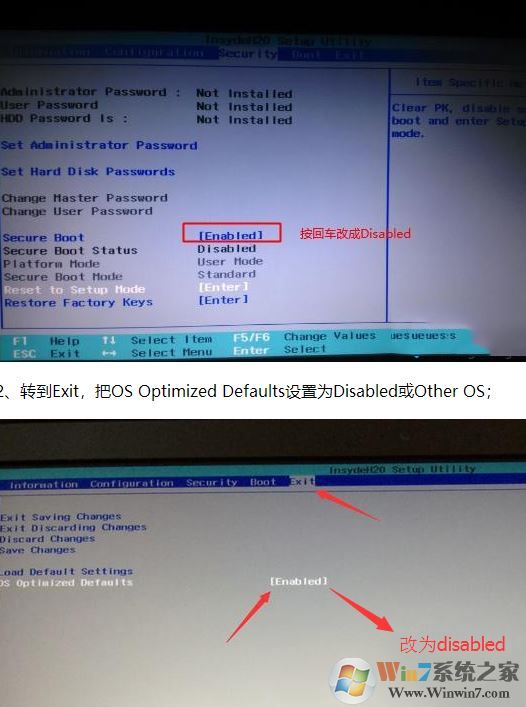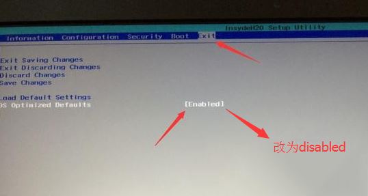 2、轉(zhuǎn)到Exit,把OS Optimized Defaults設(shè)置為Disabled或Other OS;