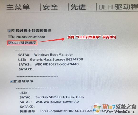 6、進入后將UEFI順序前面的勾去掉,讓機器默認(rèn)為傳統(tǒng)啟動,這樣方便安裝WIN7,如下圖所示;