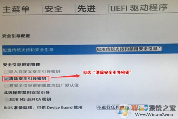 4、F10保存重啟后再次開機按ESC,然后選擇F10進入BIOS設(shè)置,將進入剛設(shè)置的地方,勾選“清除安全引導(dǎo)密鑰”,然后再次F10保存;