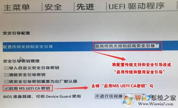 3、回車后,將配置傳統(tǒng)支持和安全引導(dǎo)設(shè)置電腦“啟用傳統(tǒng)支持和禁用安全引導(dǎo)”以及去掉“啟用MS UEFI CA密鑰”前面的勾,然后按F10保存更改;
