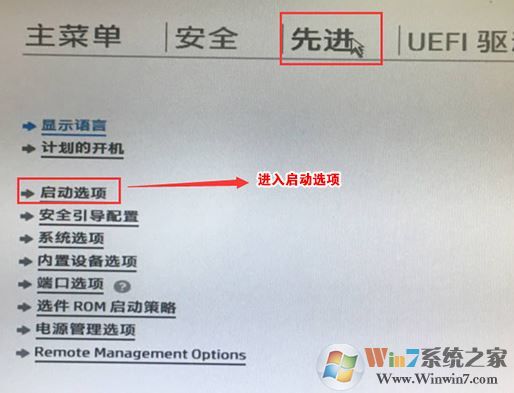 5、F10保存重啟后再次開(kāi)機(jī)按ESC,然后選擇F10進(jìn)入BIOS設(shè)置,將鼠標(biāo)移動(dòng)“先進(jìn)”選項(xiàng)中,選擇"啟動(dòng)選項(xiàng)"后回車(chē)進(jìn)入,如圖所示;